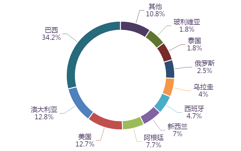 市场方面,前2个月,我国肉类及制品进口额排名前十的国家/地区分别为巴西、澳大利亚、美国、阿根廷、新西兰、西班牙、乌拉圭、俄罗斯、泰国、玻利维亚,合计占我国该产品进口额的89.2%。