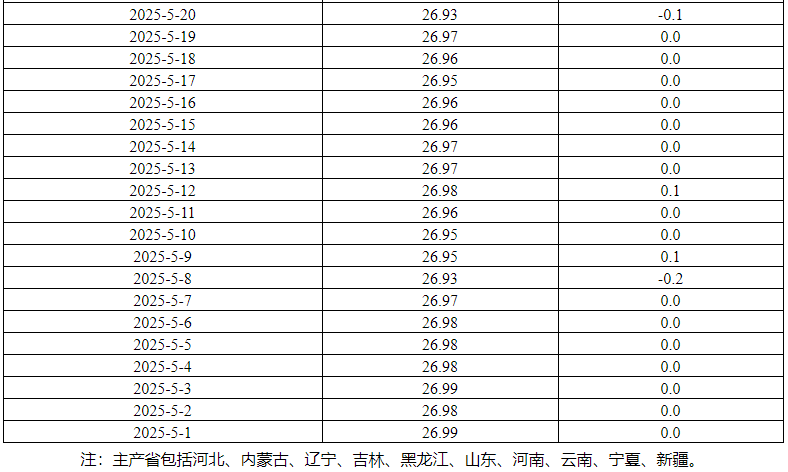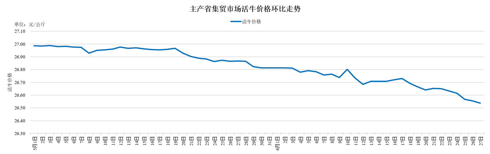 据农业农村部监测,2025年6月27日,主产省集贸市场活牛价格每公斤26.54元,同比上涨12.5%,环比下跌0.1%。