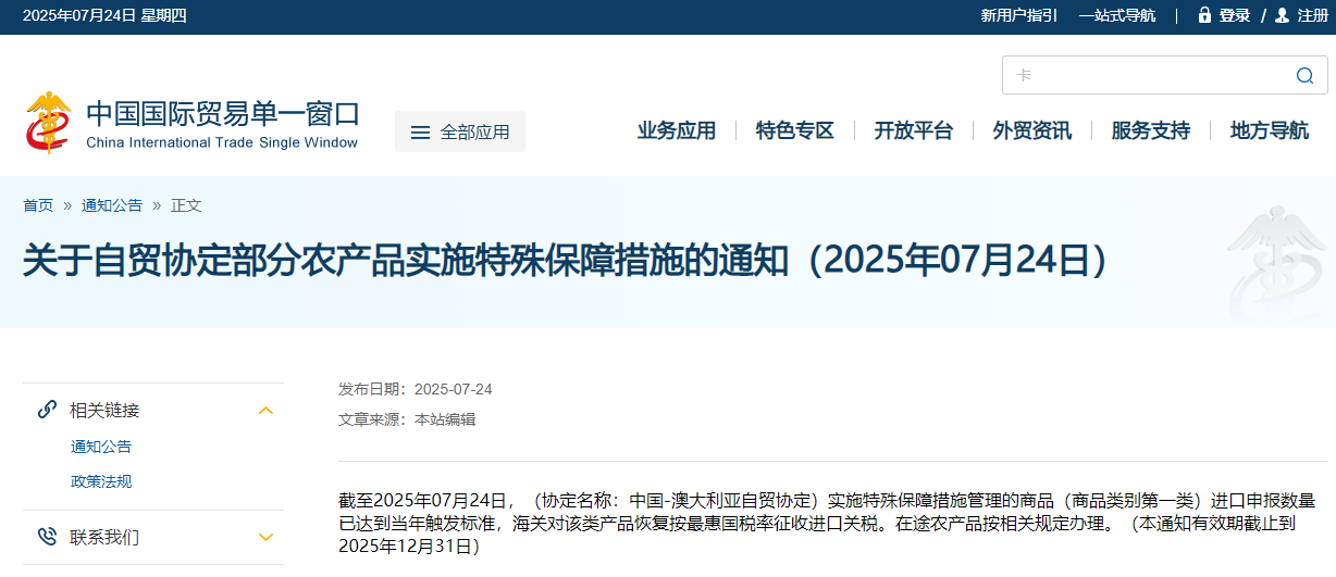 截至2025年07月24日,(协定名称:中国-澳大利亚自贸协定)实施特殊保障措施管理的商品(商品类别第一类)进口申报数量已达到当年触发标准,海关对该类产品恢复按最惠国税率征收进口关税。在途农产品按相关规定办理。(本通知有效期截止到2025年12月31日)