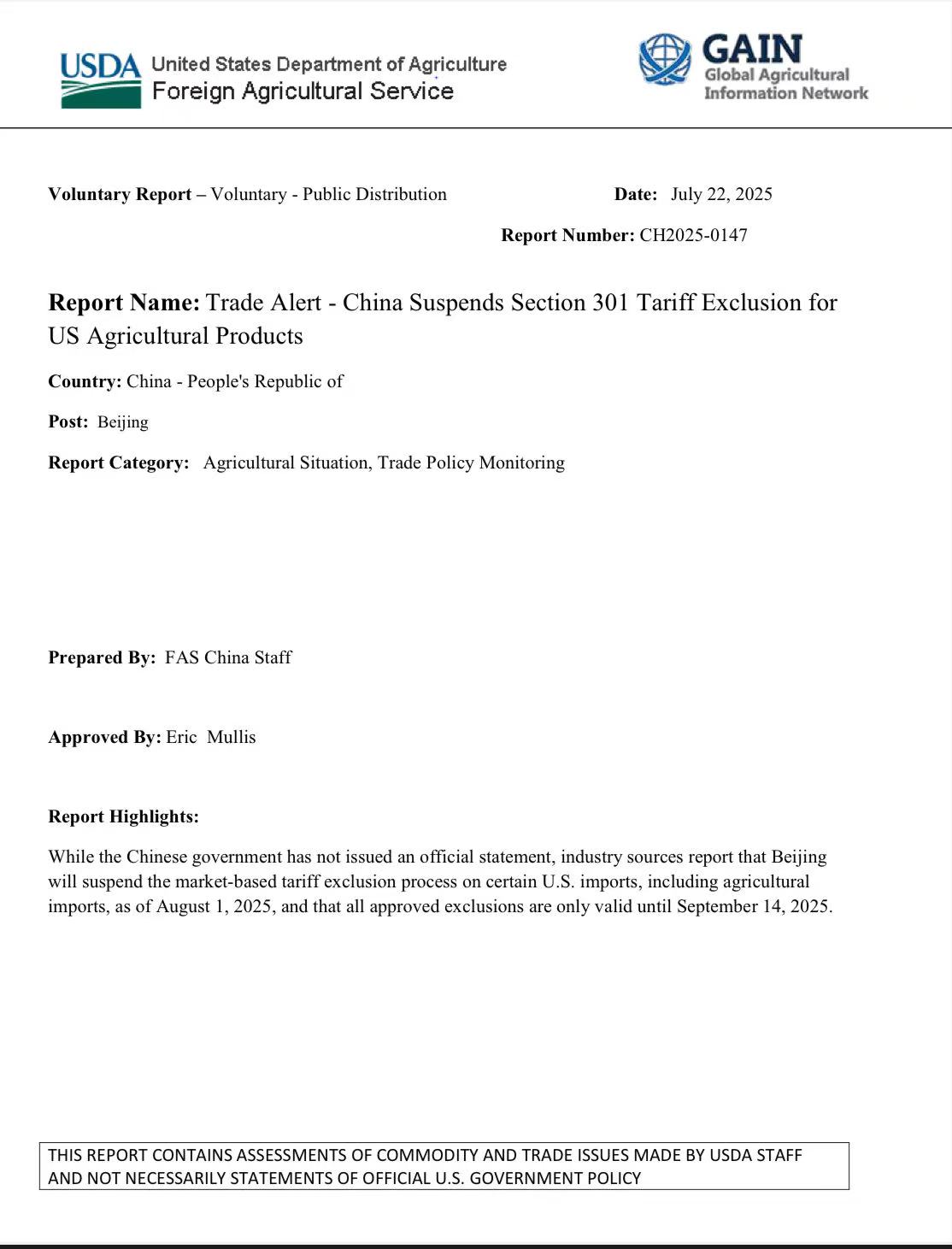 据美国农业部(USDA)最新报告显示,中国拟于8月1日起全面暂停对美国农产品的关税豁免申请,已获批的豁免也仅能维持至9月14日。这一未官宣的“静默政策”可能重创中美农产品贸易,波及谷物、肉类、水果等150余类商品,或引发全球市场连锁反应!