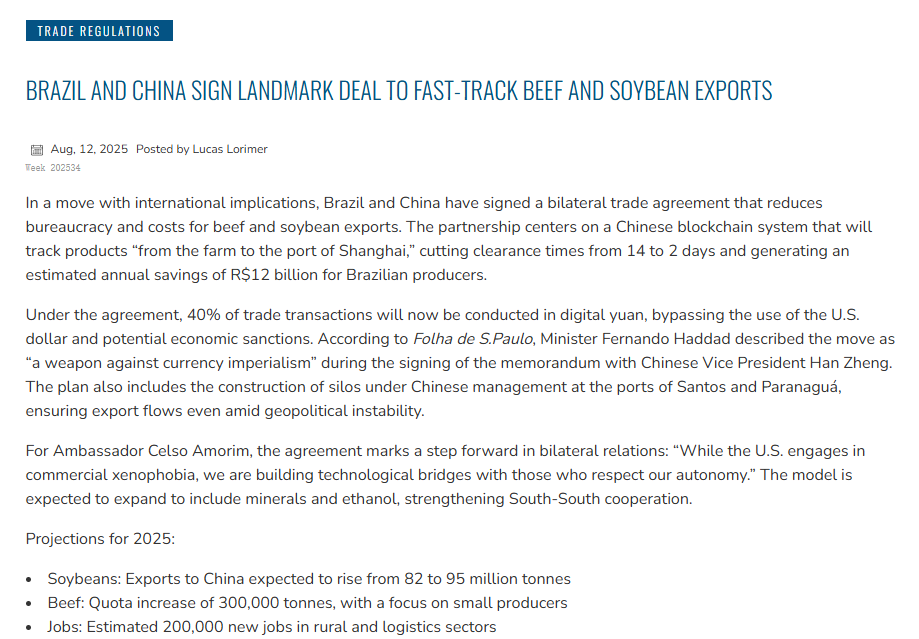 中国与巴西本周签署了一项具有里程碑意义的贸易协议,将彻底改变大豆、牛肉等农产品的跨境贸易模式。该协议依托中国领先的区块链技术,构建从巴西农场到中国港口的全流程数字化追溯体系,使海关清关时间从14天大幅缩短至2天。巴西农业部门预计,这一创新举措每年可为该国节省高达120亿雷亚尔的贸易成本。