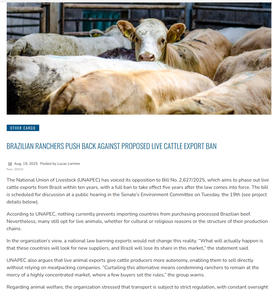 全国畜牧业联盟(UNAPEC)表示反对第 2,627/2025 号法案,该法案旨在十年内逐步淘汰巴西的活牛出口,并在法律生效五年后全面禁止。该法案定于 19 日星期二在参议院环境委员会举行的公开听证会上进行讨论(详见下文具体内容)。