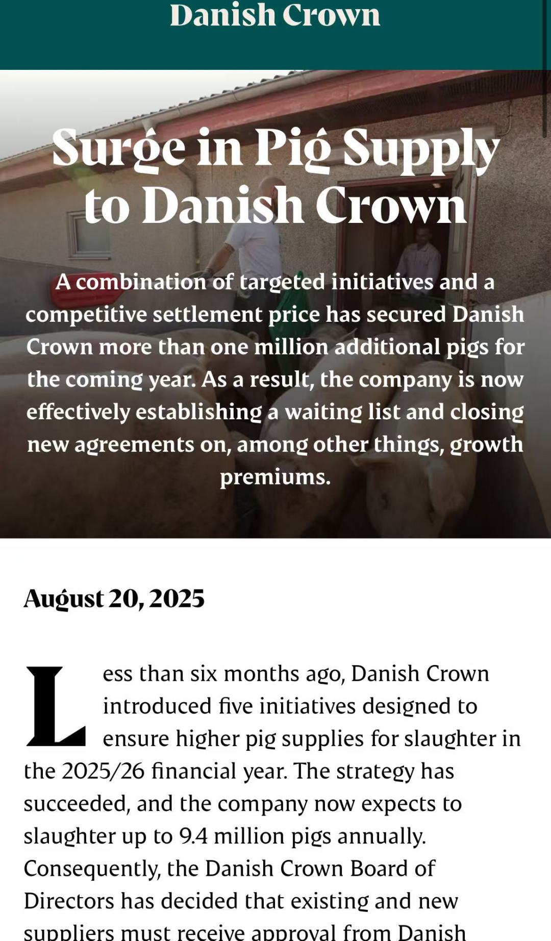 随着供应目标的超额达成,Danish Crown于8月20日上午9点启动“稳定机制”的上限锁定功能。这意味着未经事先批准,供应商将无法额外增加年度交付量,所有成员如需调整供应规模,须提前12个月报备。此外,大部分临时激励政策如增长溢价和重型生猪补贴将于9月1日起停止,但针对年轻农民和新成立合作社成员的边际贡献保证、畜舍租赁补贴等结构性支持措施仍将保留。合约交付机制和建场奖金也继续有效,为新一代农户提供入行通道。