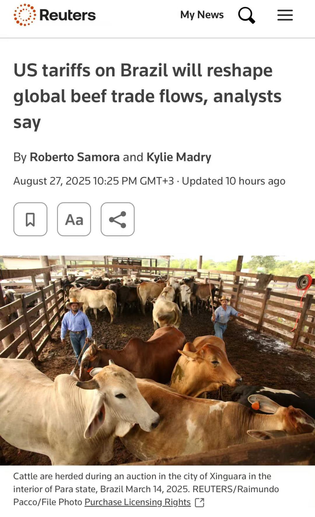 路透社圣保罗8月27日电 —— 分析师周三表示,美国近期宣布对巴西牛肉加征关税的措施,预计将显著改变全球牛肉贸易流向。这一政策可能推动墨西哥、澳大利亚等国扩大对美出口,而巴西则需积极开拓新的国际市场。