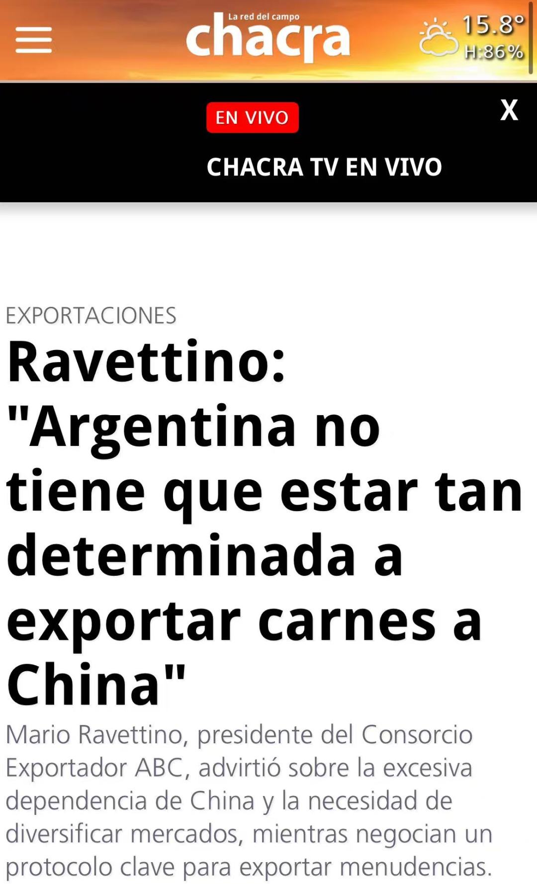 阿根廷牛肉出口联盟(ABC)主席拉维蒂诺表示,该国牛肉出口过度依赖中国市场,目前70%–75%的牛肉销往中国,存在较大风险,亟需推动市场多元化。他同时透露,阿根廷正积极寻求与中国签署一项价值约1.2亿美元的牛内脏出口协议,目前技术及卫生条款已达成一致,有望于11月正式签署。
