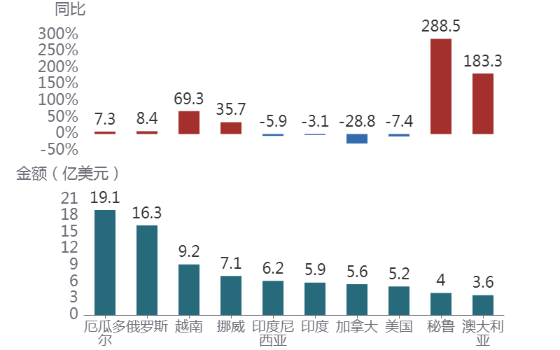 前7个月,厄瓜多尔是我国水海产品及制品进口最主要的市场,进口额为19.1亿美元,同比增长7.3%。7月当月,进口额为3.3亿美元,同比增长20.9%。