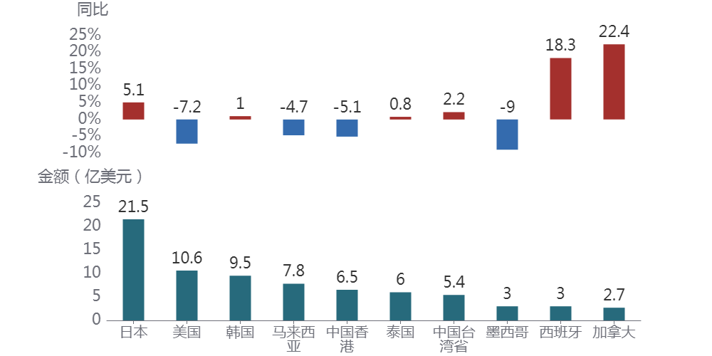 前7个月,日本是我国水海产品及制品出口最主要的市场,出口额为21.5亿美元,同比增长5.1%。7月当月,出口额为3.3亿美元,同比增长5.9%。