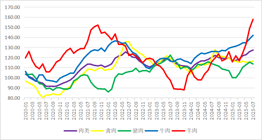 2025年8月份,FAO肉类价格指数小幅上涨,猪肉、牛肉、羊肉、禽肉价格均上涨。FAO肉类价格指数(基期为2014—2016年)2024年1月份降至108.86后反弹,2025年8月份为127.60,环比涨0.8%,同比涨4.6%。