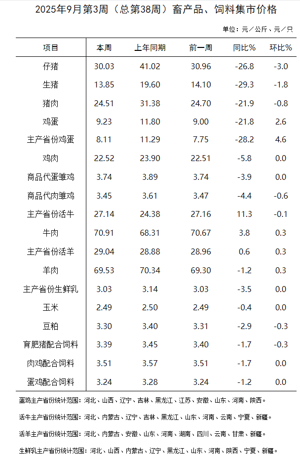 据对全国500个县集贸市场和采集点的监测,9月第3周(采集日为9月18日)鸡蛋、牛肉、肉羊价格环比上涨,生猪产品、商品代肉雏鸡、活牛、豆粕、育肥猪配合饲料价格环比下跌,鸡肉、商品代蛋雏鸡、生鲜乳、玉米、肉鸡配合饲料、蛋鸡配合饲料价格环比持平。