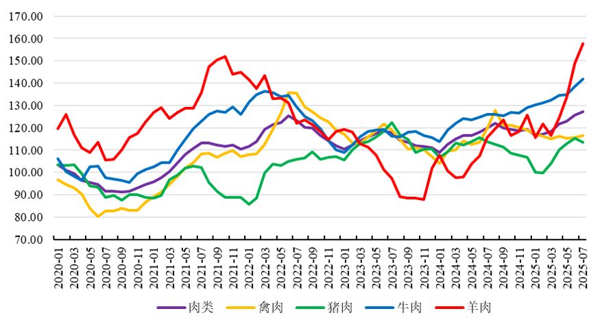 2025年8月份,FAO肉类价格指数小幅上涨,猪肉、牛肉、羊肉、禽肉价格均上涨。FAO肉类价格指数(基期为2014—2016年)2024年1月份降至108.86后反弹,2025年8月份为127.60,环比涨0.8%,同比涨4.6%。