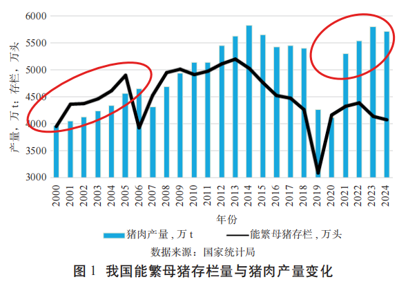种业技术的革新显著提高了产业效率。以2000年为例,全国能繁母猪存栏3954万头,猪肉产量3966万t,折合每万头母猪年产猪肉约1万t,成为后续效率对比的基准线。2001—2005年,每万头能繁母猪每年产出的猪肉量低于1万t(图1),自2006年起(2020年受非洲猪瘟影响除外),该指标持续高于1万t,且在非洲猪瘟疫情结束后的2021—2024 年上升趋势更为显著。以2024年为例,4078万头能繁母猪产出了5706万t猪肉,平均每万头能繁母猪产出猪肉量高达1.4万t。尽管单纯通过能繁母猪存栏量与猪肉产量的对比,无法精准测算出能繁母猪效率的提升幅度,但从整体变化趋势足以清晰看出,能繁母猪的生产效率实现了显著提升。这一提升背后,是育种技术优化、养殖管理精细化等多方面因素共同作用的结果,侧面反映出我国畜禽种业的发展成效。