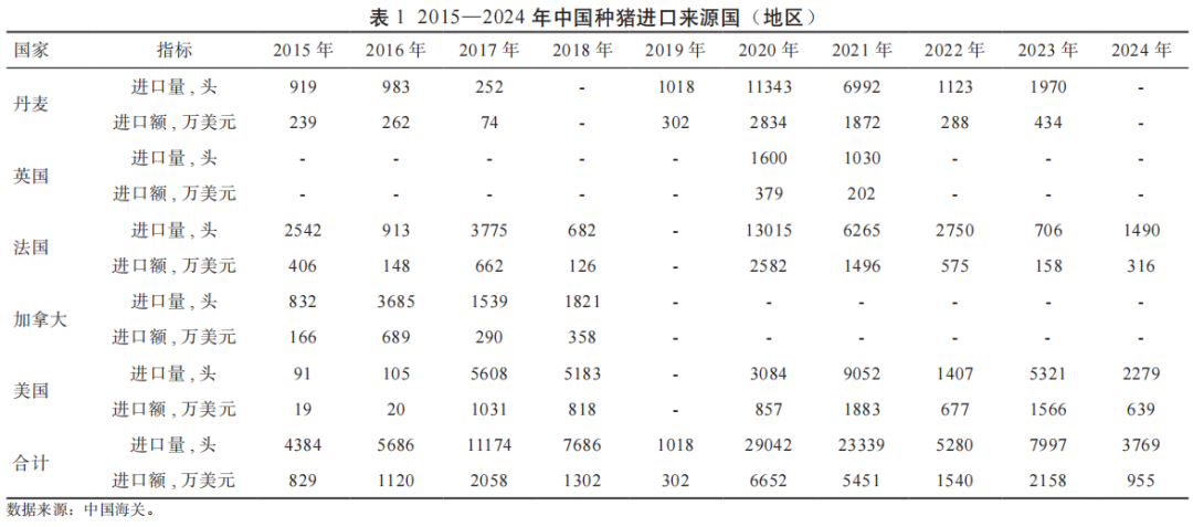 从自主育种能力来看,长期依赖进口易形成“引种-退化-再引种”的恶性循环,导致本土育种体系逐步弱化。我国自20世纪80年代起大规模引进荷斯坦奶牛,虽短期内显著提升了奶业产量与供给,却因严重“替代效应”导致本土品种(如三河牛等)濒危、自主育种停滞,至今奶牛核心种源仍高度依赖进口。此外,部分畜禽品种的国内育种研发取得成效,对进口的依赖度正逐步降低。种猪进口趋势的转变是这一进展的典型体现。如表1所示,尽管2020年受非洲猪瘟疫情影响,我国种猪进口量达到历史峰值的29042头,但此后进口量逐年下滑,2024年已降至3769头,较2020年峰值下降超87%。