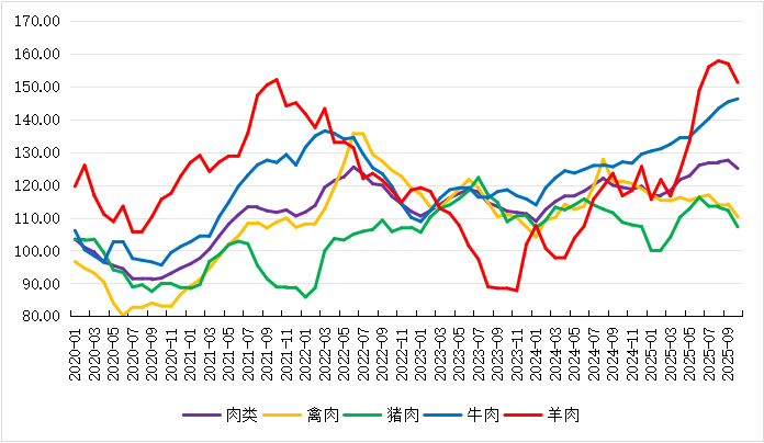 2025年10月份,FAO肉类价格指数小幅下降,其中,牛肉价格上涨,猪肉、羊肉、禽肉价格下降。FAO肉类价格指数(基期为2014—2016年)2024年1月份降至108.86后反弹,2025年10月份为125.00,环比跌2.2%,同比涨4.8%。