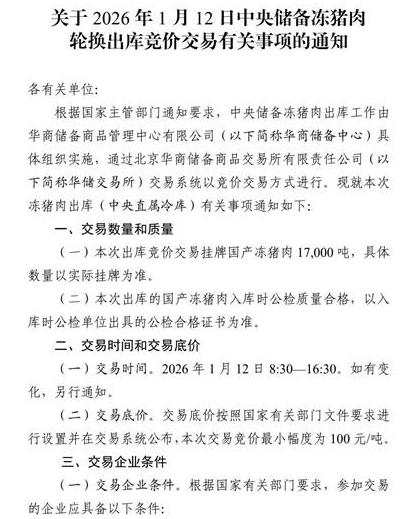 《关于2026年1月13日中央储备冻猪肉轮换收储竞价交易有关事项的通知》显示,将于1月13日收储竞价交易挂牌17000吨。