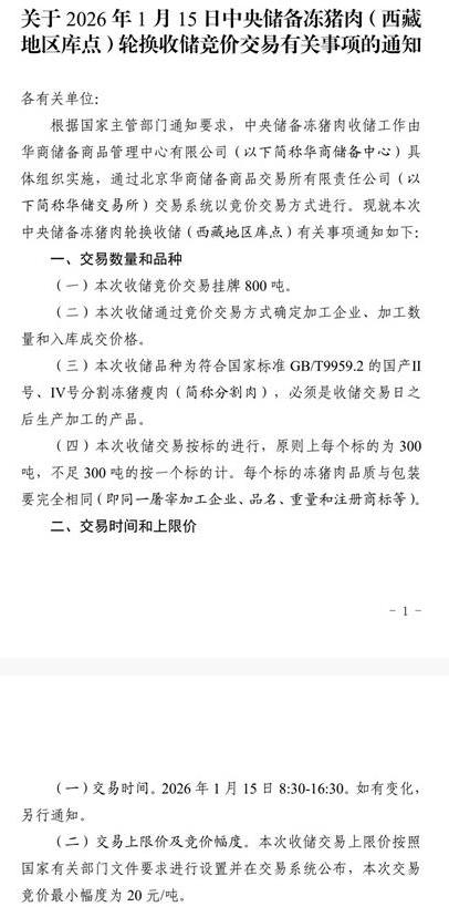 《关于2026年1月15日中央储备冻猪肉(西藏地区库点)轮换收储竞价交易有关事项的通知》显示,将于1月15日收储竞价交易挂牌800吨。