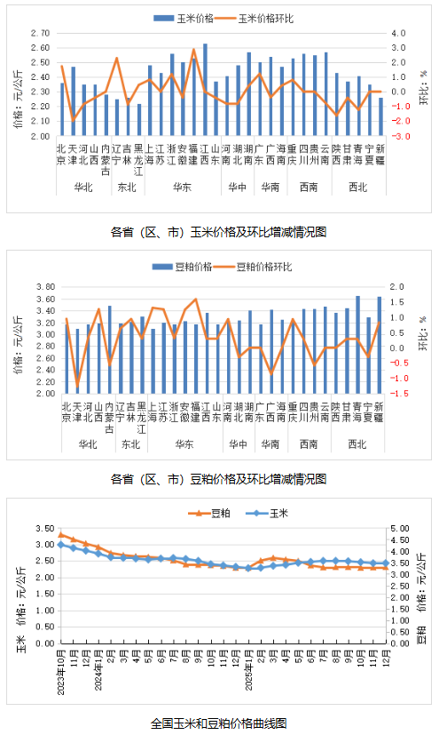 据对全国500个县集贸市场和采集点的监测,2025年12月份,鸡蛋、肉羊、豆粕、肉鸡配合饲料价格环比上涨,生猪产品、商品代雏鸡、鸡肉、肉牛价格环比下降,生鲜乳、玉米、育肥猪配合饲料、蛋鸡配合饲料价格环比持平。按集贸市场监测口径,本月猪粮比价为5.01:1,比上月下跌0.15个点。