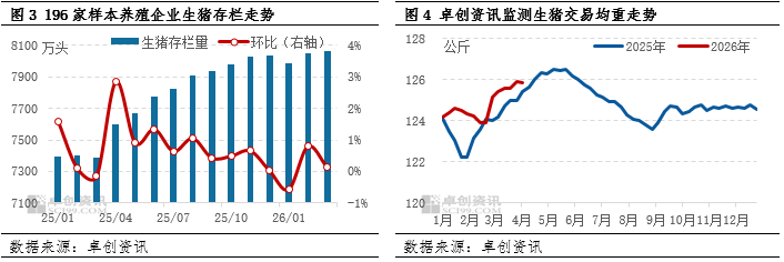 卓创资讯监测196家样本养殖企业数据显示,3月份生猪存栏量环比增加。主要受前期产能充裕传导与阶段性出栏节奏变化影响。一方面,前期能繁母猪存栏相对充足,对应到3月形成充足的生猪接续供给,叠加养殖效率稳步提升,仔猪成活率与育肥猪存量相应增加。另一方面,3月份养殖端亏损,出栏积极性高位,需求端表现一般,下游消化力度不敌上游出栏力度,养殖端出栏节奏受限,整体出栏进度不及生猪新生补栏速度。除此之外,受需求限制,部分养殖端仍存在被动压栏现象,截至3月底,卓创资讯监测生猪交易均重为125.89公斤,同比增加0.74%,大猪消化进度偏缓。两方面导致生猪存栏总量呈现环比增加态势,与能繁母猪去化形成阶段性分化。