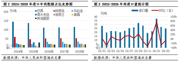 牛肉需求持续增长,进口依赖度先增后减。2025年我国牛肉总消费量约1080.00万吨,较2024年增长3.48%。其中进口牛肉达283.39万吨,占比26.24%,较2024年占比下滑1.00个百分点,国内牛肉产量增至801万吨,占比74.16%,进口牛肉占比份额有所下滑。受政策收紧叠加配额限制,2026年起实施“国别配额+配额外55%关税”,全年配额268.8万吨,较2025年减少5.15%,进口占比或将进一步下降。
