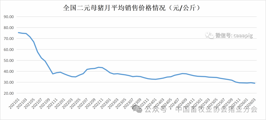 1、2026年3月份全国二元母猪销售价格29.12元/公斤,环比下跌1.6%,同比下跌16.0%。